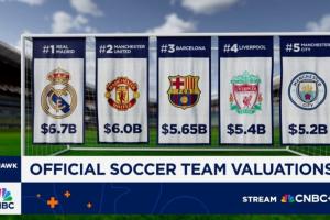 体育资讯05月06日讯 美国媒体CNBC公布了2025年全球足球俱乐部的估值情况,皇马、曼联、巴萨、利物浦、曼城排名前五。